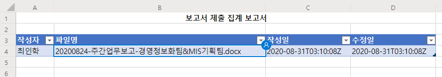 아래 예시파일과 같이 "작성자", "파일명", "작성일", "수정일"이 자동으로 등록되도록 만들기 위해 양식을 지정하고