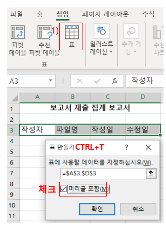 컬럼의 첫 줄은 제목이므로 "머리글 포함"에 체크 박스를 지정합니다.