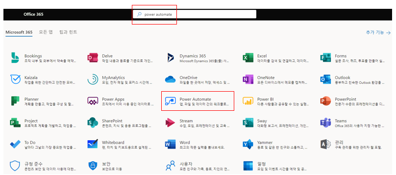 PowerAutomate 앱이 보이지 않는 경우, 아래와 같이 검색을 하셔도 됩니다.