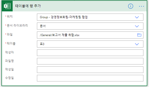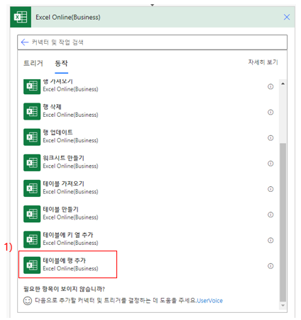 기본 제공하는 동작 중 "테이블에 행 추가" 동작을 선택해 줍니다.